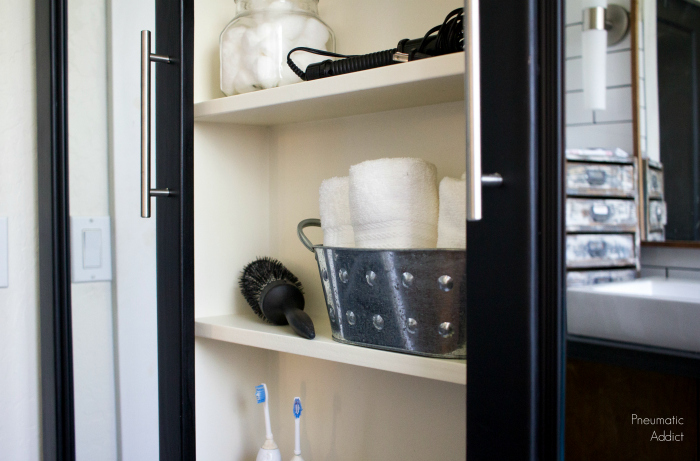 Pneumatic Addict compartió la remodelación completa de su baño principal con nosotros. Un proyecto que nos llamó la atención fue el botiquín con puerta de granero.
